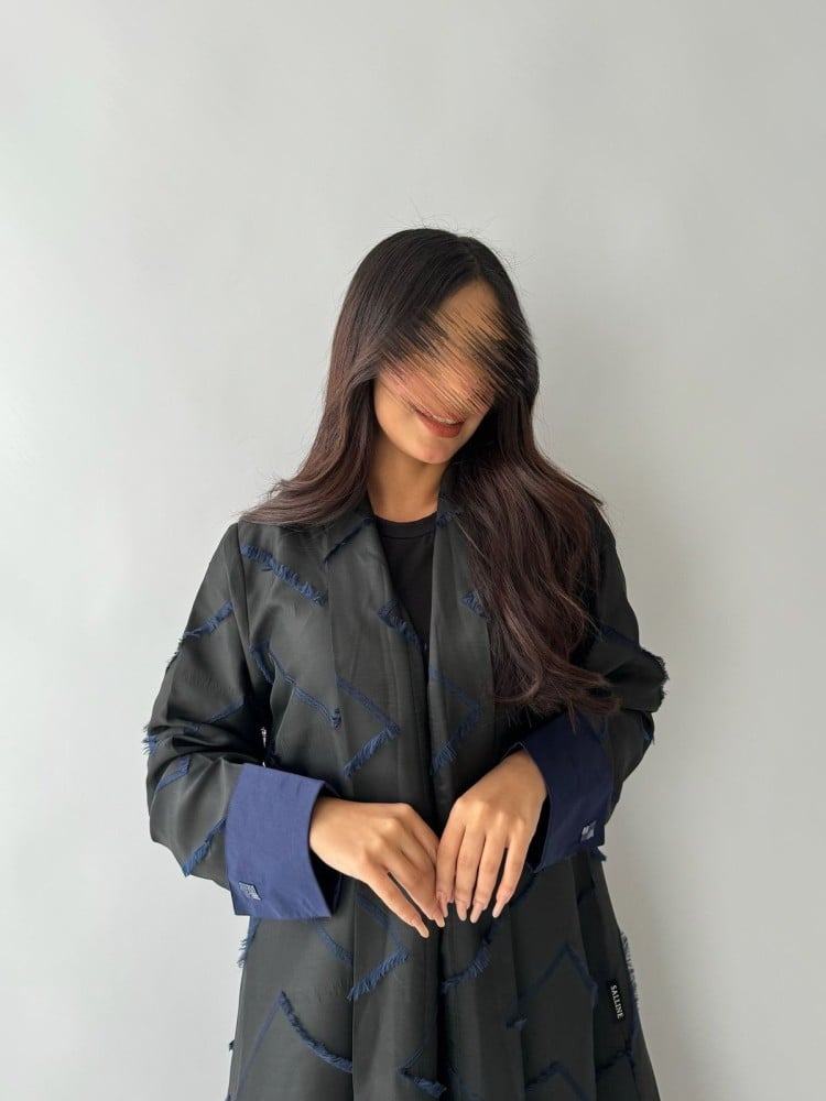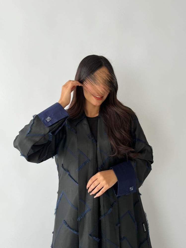 - ( اسود مطعم بالشك اليدوي الكحلي على الأكمام ).