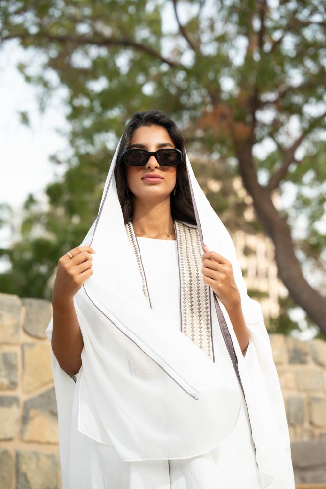 يأتي معه شيله نفس اللون وعليها قيطان من الاطراف