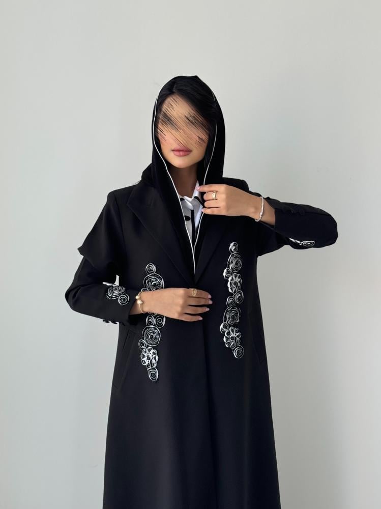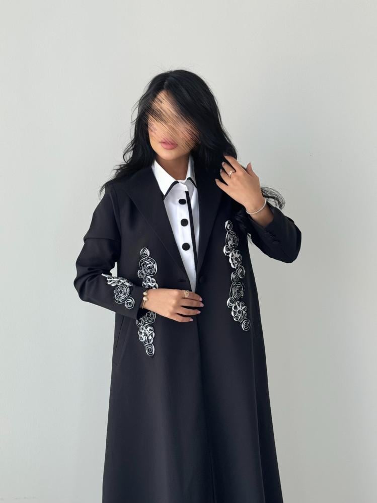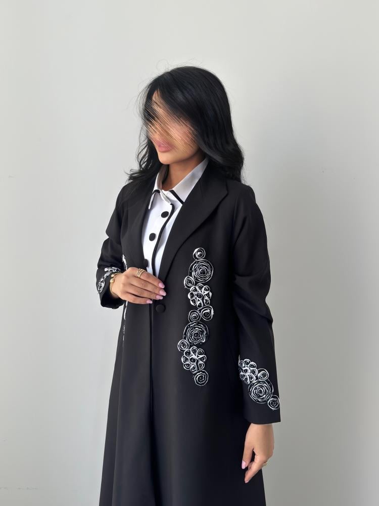 عباية بليزر أسود مبطن مع كُلف مستورده بتطريز أسود وأبيض مزين باللولو الأسود على الاكمام والعبايه